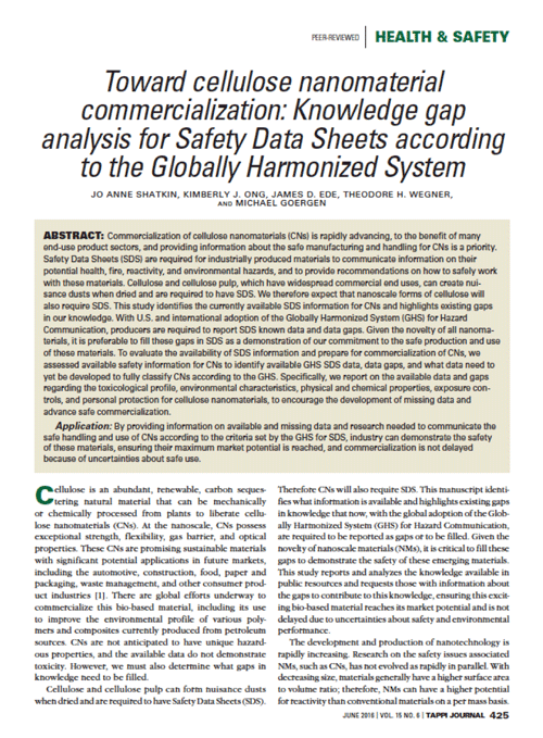 Jo Anne Shatkin, Kimberly J. Ong, James D. Ede, Theodore H. Wegner, and Michael Gergen. (2016). Toward cellulose nanomaterial commercialization: Knowledge gap analysis for Safety Data Sheets according to the Globally Harmonized System, TAPPI Journal.